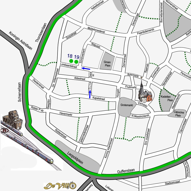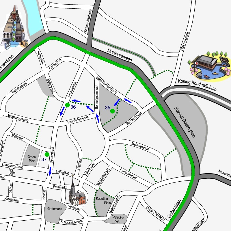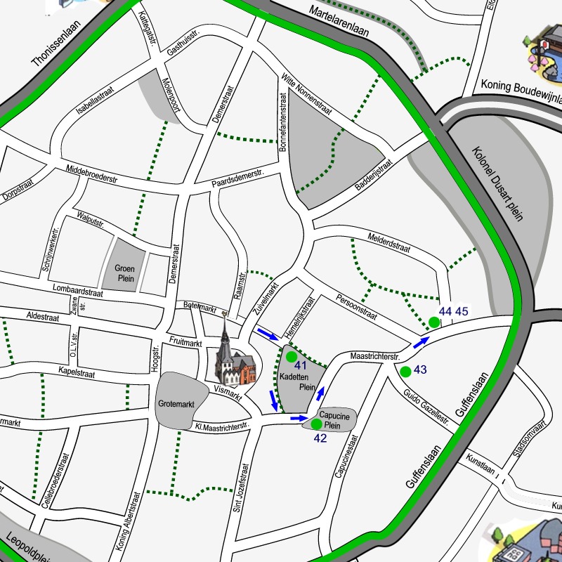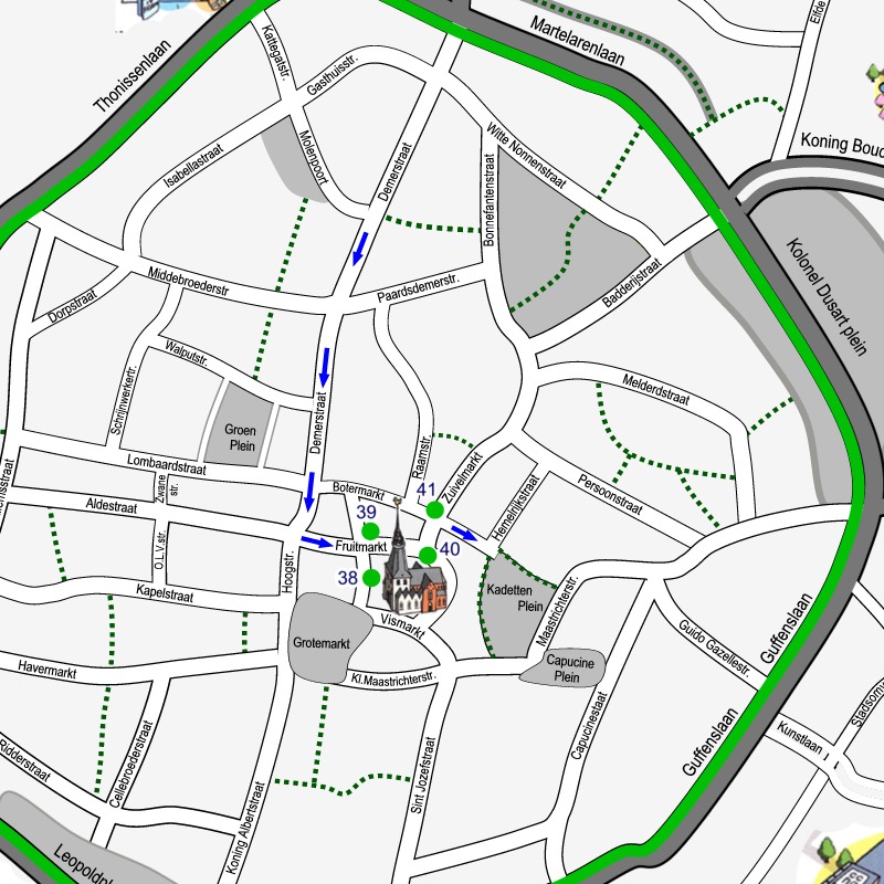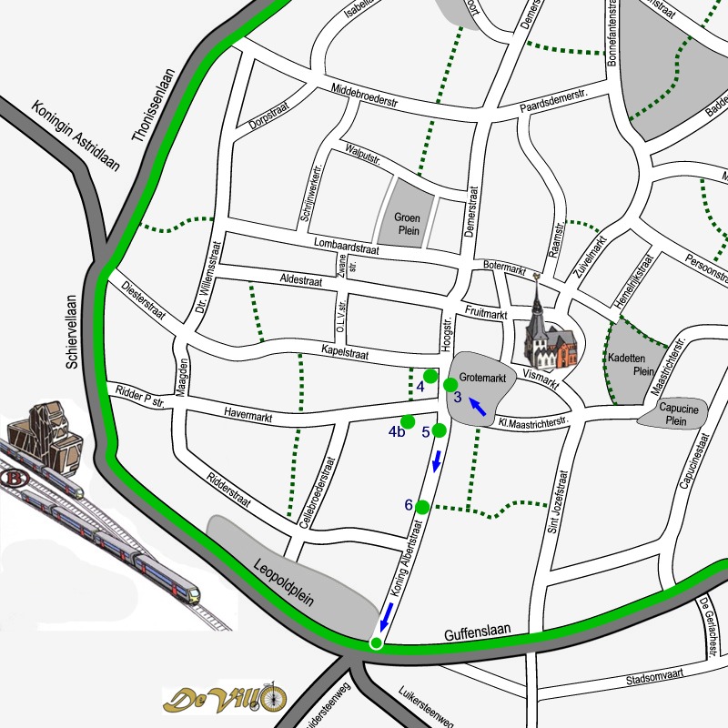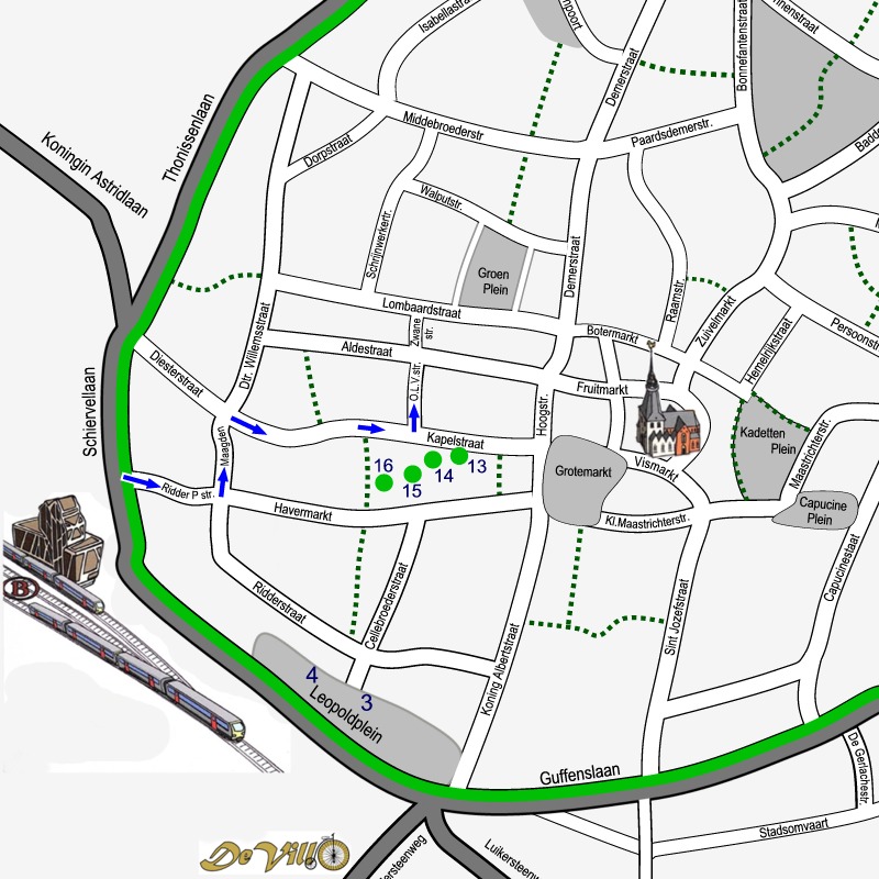 Doe de wandelschoenen aan en geniet van onze city tour dwars door de binnenstad van Hasselt. 5 km langs 14 sites en 54 monumenten. Klik op de link SITE… om telkens het stadsplan te zien met de route door de getoonde site. De bezienswaardigheden op elk plan zijn genummerd volgens de volgorde van de afbeeldingen. Maak kennis met het rijke erfgoed, de kunst en cultuur van de stad Hasselt. Achter de rode titels vindt je wat informatie!.