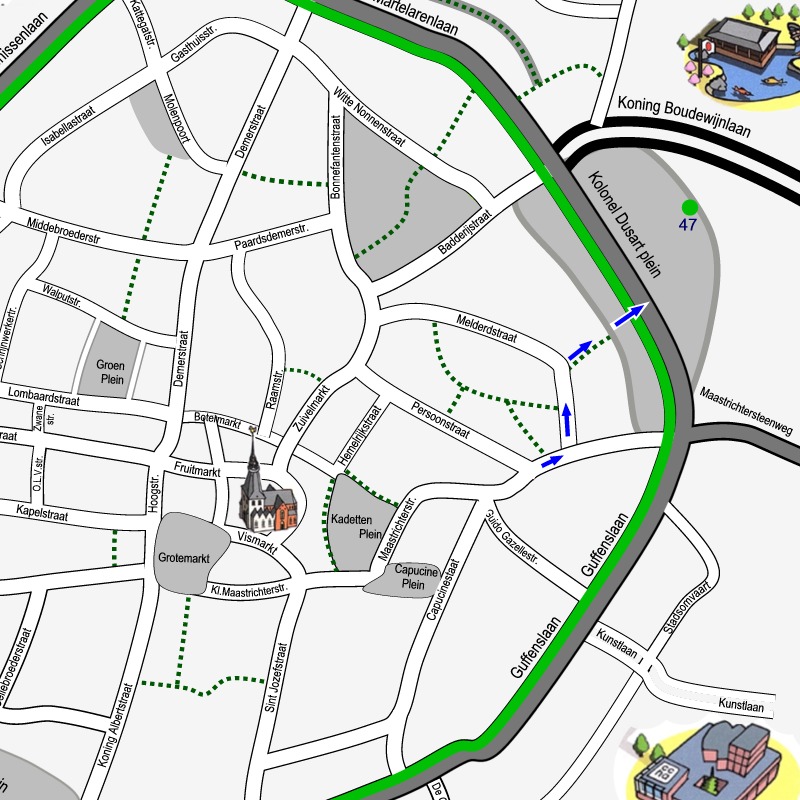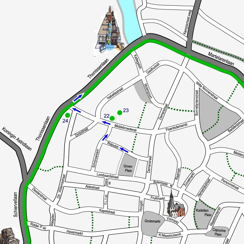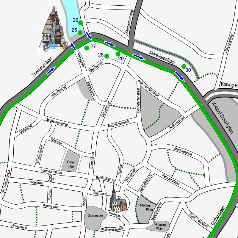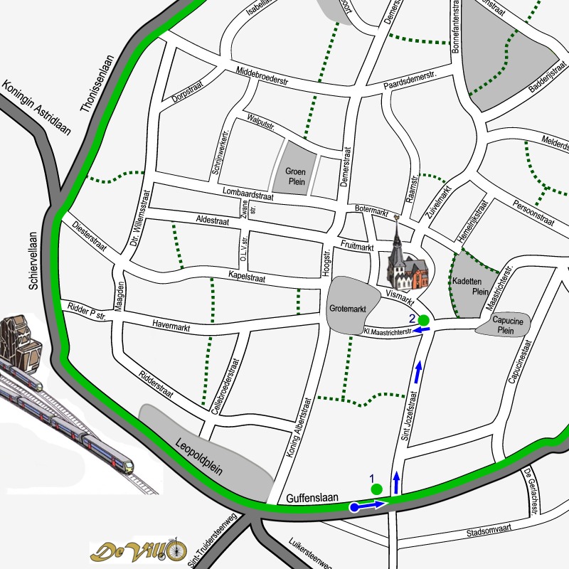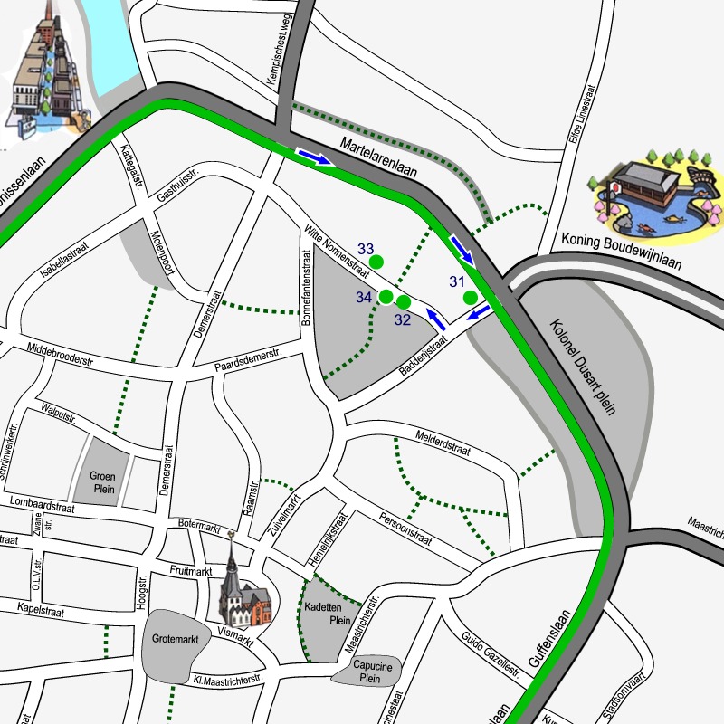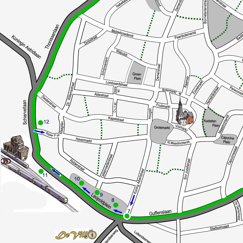 Doe de wandelschoenen aan en geniet van onze city tour dwars door de binnenstad van Hasselt. 5 km langs 14 sites en 54 monumenten. Klik op de link SITE… om telkens het stadsplan te zien met de route door de getoonde site. De bezienswaardigheden op elk plan zijn genummerd volgens de volgorde van de afbeeldingen. Maak kennis met het rijke erfgoed, de kunst en cultuur van de stad Hasselt. Achter de rode titels vindt je wat informatie!.